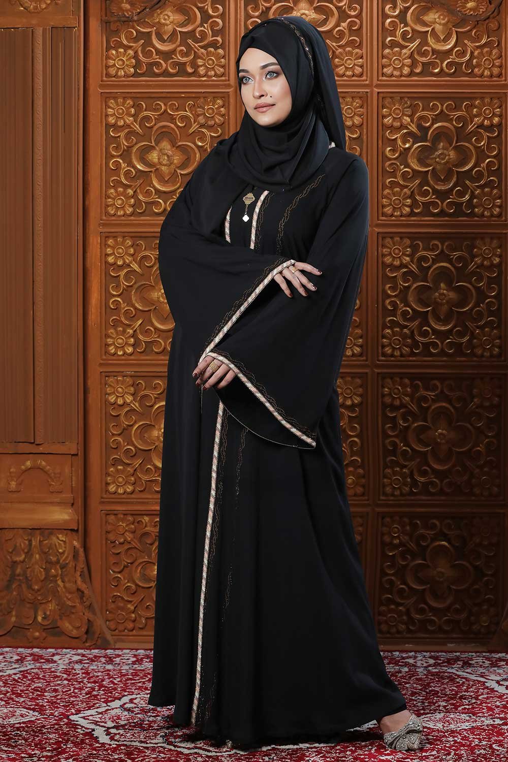 Black Color Gown Borka – Lace & Stone Work is a luxurious and elegant modest wear piece. Crafted in classic black, this gown-style borka features delicate lace detailing and stone embellishments, adding sophistication and glamour. Perfect for special occasions, Islamic gatherings, and festive events, it combines modesty, style, and refined craftsmanship.