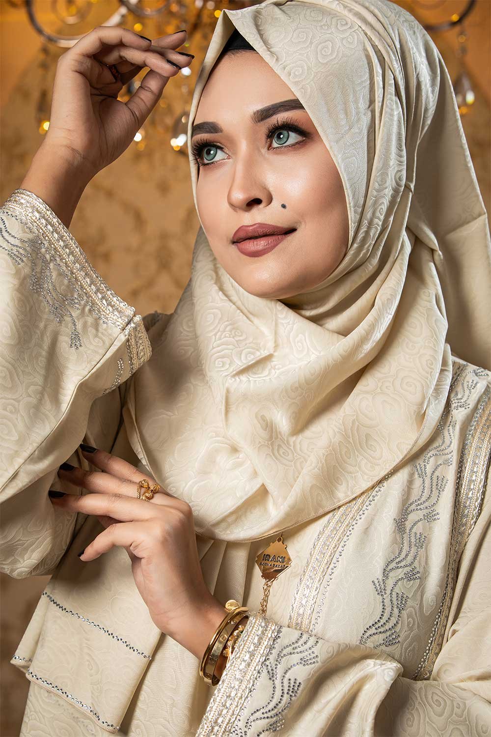 Cream Color Borka – Lace & Stone Work is a graceful and elegant modest wear piece. Designed in soft cream color, this borka features delicate lace detailing and stone embellishments that add a refined and sophisticated touch. Perfect for daily wear, Islamic gatherings, and special occasions while maintaining modesty and comfort.