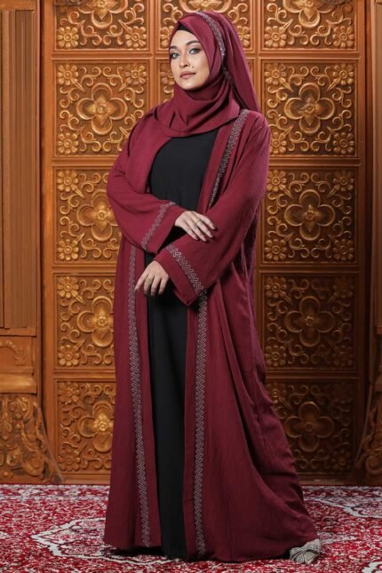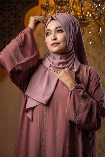 Dark Chocolate Color Gown Borka – Stone Work is a luxurious and elegant modest wear piece. Designed in rich dark chocolate color, this gown-style borka features delicate stone embellishments that add a refined and sophisticated touch. Perfect for special occasions, Islamic gatherings, and festive events while maintaining modesty and comfort.