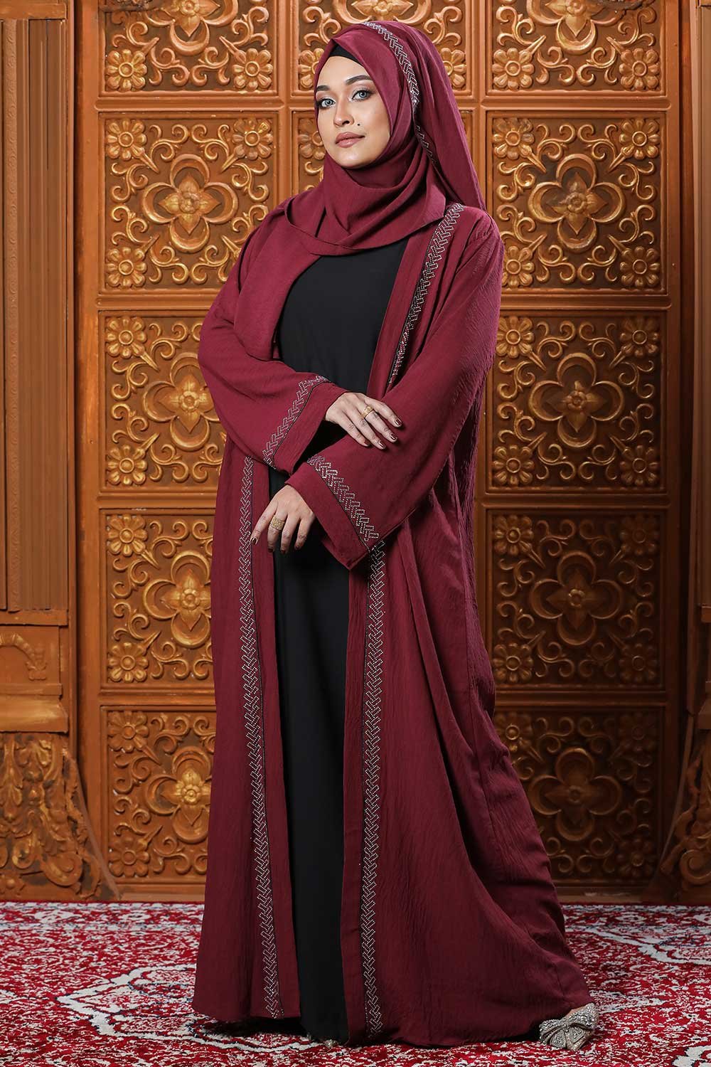 Maroon Color Koti Borka – Stone Work is a stylish and elegant modest wear piece. Crafted in rich maroon, this koti-style borka features delicate stone embellishments that enhance its sophisticated and fashionable look. Perfect for special occasions, Islamic gatherings, and festive events while maintaining modesty and comfort.