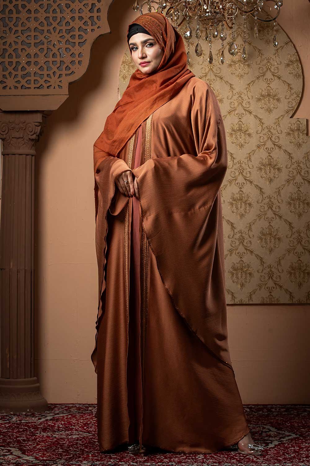 Orange Color Abaya – Lace & Stone Work is a stylish and elegant modest wear piece. Designed in vibrant orange, this abaya features delicate lace detailing and stone embellishments that add a graceful and sophisticated touch. Perfect for daily wear, Islamic gatherings, and special occasions while maintaining modesty and comfort.